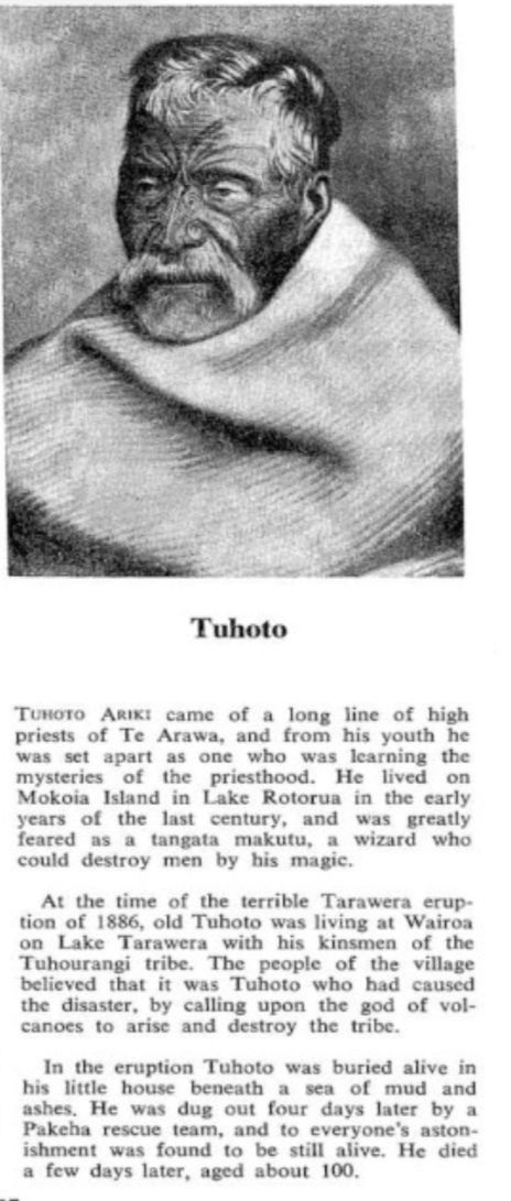 On looking through an earlier section of Charles' book I came across a clipping that was simply headed TUHOTO. Alongside the article was a picture of Tuhoto which described him as The Maori Tohunga (Priest) of Wairoa. The article is not dated but it records that news of the death of Tuhoto had just been received. The article noted that Tuhoto had been a survivor of some 104 hours of being buried under ash at Wairoa at the time of the Tarawera eruption.